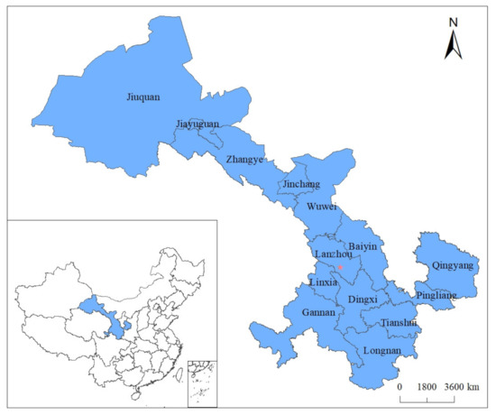 The study area of this paper is the Gansu Province of China. Gansu Province is rich in tourism resources. Many resources are unique and irreplaceable in the country and even in the world. By the end of December 2019, Gansu Province had 6 5A scenic spots, 99 4A scenic spots, and 132 3A scenic spots, receiving 370 million tourists and realizing tourism revenue of CNY 268 billion. The study area of this paper is shown in