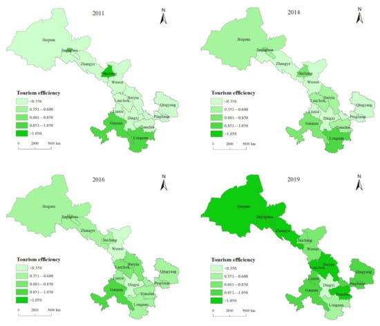 Figure 3. In 2011, the tourism efficiency level of Gansu Province was generally low, and the high-efficiency values were relatively scattered. In the distribution map, the efficient colors of Gannan and Longnan City in the south of Gansu Province, Jinchang City in the center of Gansu Province, and Jiayuguan City in the northwest of Gansu Province were darkest, and the colors of other cities were very shallow. In 2014, the efficiency distribution map color was darker than that in 2011, showing the distribution characteristics of “high at both ends and low at the middle”. Longnan City and Gannan Tibetan Autonomous Prefecture in the south of Gansu Province, and Jiuquan City and Jiayuguan City in the north are darker. The colors of tourism efficiency values in central Gansu Province were relatively light, except for Jinchang City. In 2016, the high-efficiency areas in southern Gansu Province moved northward, and the efficiency colors of Lanzhou City and Baiyin City became darker, while the tourism efficiency of Longnan City decreased. In 2019, the color of tourism efficiency’s distribution map had become significantly darker, and the color difference between regions had become smaller. The high-efficiency values were concentrated in Jiayuguan City, Jiuquan City, and Zhangye City in the Hexi Corridor, Lanzhou City, and Baiyin City in the central of Gansu Province, and Qingyang City, Pingliang City, and Tianshui City in southeastern of Gansu Province. Meanwhile, Dingxi City and Longnan City in southern Gansu Province had the lowest tourism efficiency.