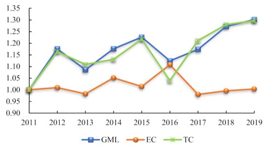 Malmquist index can dynamically reflect the change and trend of the research object’s relative efficiency. The traditional Malmquist index cannot be compared across periods. In contrast, the GML index took the sum of each period as the reference set, which can be compared across periods when studying efficiency [