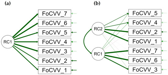 Path diagram for (a) Model 1 with a one-factor solution and (b) Model 2 with a two-factor solution of the fear of vaccination scale. FoCVV = item of the Fear of Coronavirus Vaccination, RC = rotated component.