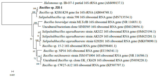 16S rRNA gene sequence-generated phylogenetic tree showing the relationships of Bacillus sp. ZH-1 and its closest relatives.
