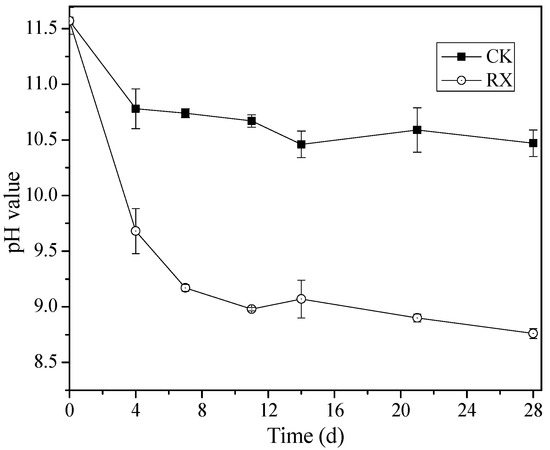 The changes in the pH value of BR are shown in Figure 3. In the CK treatment, the pH value of BR decreased from 11.6 to 10.8 within 4 days and then further decreased with incubation time, reaching the lowest pH value of 10.5. In the RX treatment, the pH value of BR decreased from 11.6 to 9.7 within 4 days and then decreased gradually to 8.8 after 28 days of incubation. Due to the low pH of the yeast extract, the pH of the optimal medium is about 5.5 in the present study. Therefore, the pH of the BR in both the CK and RX treatments were decreased obviously after mixed with the optimal medium (0 to 4 days), but the RX treatment decreased more obviously, which indicates that ZH-1 promoted the decrease in the pH of the BR.