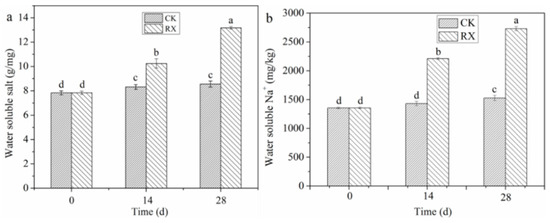 After 14 and 28 days of incubation, the water-soluble salt content increased from 7.84 to 8.32 and 8.56 g/kg in the CK treatment and from 7.84 to 10.25 and 13.18 g/kg in the RX treatment (Figure 4a). The application of the medium increased the salt solubility slightly, but the change between 14 and 28 days was not significant. ZH-1 inoculation increased the salt solubility by 23.20% and 53.97% compared with CK after 14 and 28 days of incubation, respectively. In addition, the change of water-soluble Na+ was similar to that of the water-soluble salt (Figure 4b). Water-soluble Na+ increased slightly with the incubation time in the CK treatment. However, its content increased more than 54.59% and 78.75% after 14 and 28 days of incubation, respectively, in the RX treatment. These results indicate that ZH-1 can enhance the release of salt in BR.
