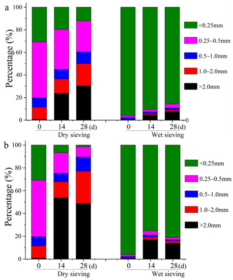 Aggregate is a basic physical property of soil, which can reflect the water retention, permeability, and erodibility of soil and soil analogs [34]. The aggregate size distribution of BR in the CK and RX treatments are presented in Figure 5. For the dry sieving method, the aggregate size increased obviously in both treatments. The mechanical-stable aggregates (D0.25) increased from 69.11% to 80.23% (14 d) and 87.87% (28 d) in CK, and to 93.23% (14 d) and 98.55% (28 d) in RX. A similar result appeared for the wet sieving method, the water-stable aggregates (W0.25) increased from 3.89% to 9.38% (14 d) and 14.27% (28 d) in CK, and to 24.74% (14 d) and 18.82% (28 d) in RX.