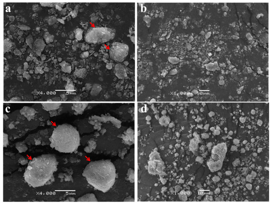 The addition of the medium (CK) can stimulate the growth of indigenous microorganisms, and enhance the aggregate formation of BR by extracellular polymeric substance and fungal hyphae [40]. At the same time, the application of ZH-1 (RX) further promoted the formation of aggregates compared with CK, indicating that the existence of the saline-alkali tolerant bacteria is conducive to the formation of aggregates. SEM analysis showed that the BR in CK treatment contained many small flake-structured, irregular shapes and unsmooth edge particles (Figure 6a,b). In RX treatment, the flake structure became larger, regular, and compact with a flat edge, and the size of the aggregates obviously increased (Figure 6c,d). These results further verified that ZH-1 improved the physical properties of BR.