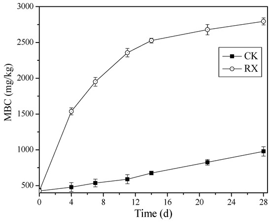 Change of MBC in BR with (RX) and without (CK) the application of ZH-1. These results are presented as mean ± standard deviation (n = 3).