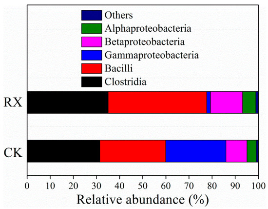 The bacterial diversity and community compositions in neutralized BR at class level are shown in Figure 8. Due to the fact that total DNA cannot be extracted from the original BR, the bacterial diversity and community composition cannot be shown in the present study. Bacterial community analysis showed that approximately thirteen known classes were identified from the neutralized BR in both CK and RX treatment, and more than 98% of these classes were affiliated to Clostridia, Bacilli, Gammaproteobacteria, Betaproteobacteria and Alphaproteobacteria (Figure 8). Bacilli, Gammaproteobacteria and Alphaproteobacteria have been identified from natural weathered BR by Wu et al. [48], but the classes of Clostridia and Betaproteobacteria have not been identified from BR in previous reports. Krishna et al. reported that Betaproteobacteria, Gammaproteobacteria and Bacteroidetes are the major bacteria in BR [49], which is partially consistent with our present study.