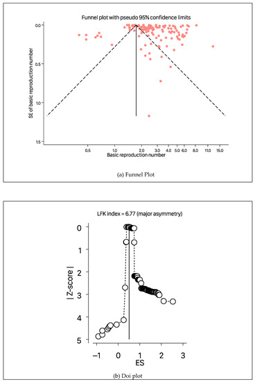 We summarised the findings from the included studies using both narrative synthesis and meta-analysis. A narrative review was used for studies that did not report confidence or credible intervals or other forms of intervals for reproduction numbers, as these could not be included in the meta-analysis. Ranges were converted into confidence intervals using appropriate formulae (Supplementary File S1). Studies with reproduction numbers and estimated confidence intervals were included in the meta-analysis. We first used fixed-effect meta-analysis to obtain the pooled reproduction numbers for studies that estimated multiple reproduction numbers for the same country based on different assumptions and methods. We later utilised this pooled estimate to calculate a summary estimate using a fixed-effect or random-effects meta-analysis based on heterogeneity across studies ( statistics) [14]. The , , and Q values were used to examine the extent of heterogeneity between studies. We used the restricted maximum likelihood (REML) method in the case of the random-effects meta-analysis [15]. Log-transformed values of the effect sizes were used in the meta-analysis model, and the results were transformed back to ensure that the pooled effect size was larger than zero (0). Pooled effect sizes, along with a 95% confidence interval, were presented. We assessed the possibility of publication bias through a visual inspection of asymmetry in funnel and Doi plots and through a LFK index to measure asymmetry [16]. When evidence of publication bias was confirmed, we performed the trim-and-fill procedures to account for the possible publication bias [17]. Details on subgroup analysis and sensitivity analysis are presented in Supplementary File S1.