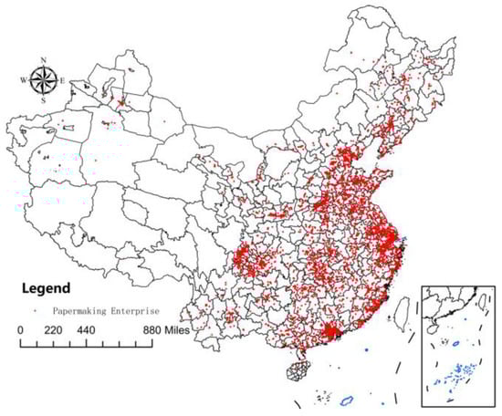 To construct the required panel data, it was necessary to match the three micro-databases effectively. Although the EPS database can provide matched data, there is a serious problem with sample selection in their data form. Therefore, in the first step, the methodology by Brandt et al. (2012) was used to merge the databases of Chinese industrial enterprises into panel data []. At the same time, the data were cleaned up according to the method of Nie et al. (2012) []. The second step was constructing basic enterprise panel data from China Industrial Enterprise Database and China Industrial Enterprise Pollution Database. According to Tian and Yu (2013), the third step matches the Chinese customs enterprises’ database []. As numerous variables were missing in the 2010 data in China’s industrial enterprise database, the year 2010 was removed from the study. Finally, the enterprises with an industry classification code of 22 are selected, representing the paper industry. In this way, a total of 24,092 enterprises were obtained. Among them, state-owned enterprises accounted for 13.71%, private enterprises accounted for 55.92%, Chinese foreign joint ventures accounted for 7.31%, wholly foreign-owned enterprises accounted for 5.29%, and other types of enterprises accounted for 17.77%. Enterprises producing machine-made paper and paperboard accounted for 70.87%, enterprises producing paper and paperboard containers accounted for 13.34%, and enterprises of other types accounted for 15.79%. The spatial distribution of samples is shown in Figure 1 [].