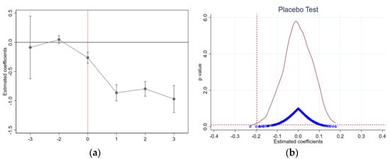Parallel trend test (a) and placebo test (b). Note: In the parallel trend test (a), the horizontal axis indicates the period before and after EID policy implementation, 0 represents the current period, 1 represents one year after implementation, and −2 represents two years before policy implementation. In multi-period DIDs, to avoid collinearity, period −1 should be excluded, in which the solid point represents the value of the coefficient, and the extension line represents the confidence interval of 95%. In the placebo test (b), the blue circles represent the coefficient calculation results of 500 groups of virtual policy variables, and the red curve represents the distribution of coefficients. The red horizontal dotted line illustrates the significance level of 10%, and the value of coefficients in benchmark regression is illustrated by the red vertical line.
