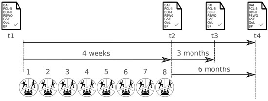 Schedule of the project. Measurement of study outcomes at four timepoints. Notes: BAI: Beck Anxiety Inventory, PCL-5: Post-traumatic Stress Disorder Checklist, BDI-II: Beck Depression Inventory, PSWQ: Penn State Worry Questionnaire, GSE: General Self-Efficacy, QoL: Quality of Life, BP: biological parameters, t1: before the program, t2: at the end of the program, t3: three-month follow-up, t4: six-month follow-up, ✓: completed questionnaires, 1–8: attended sessions.