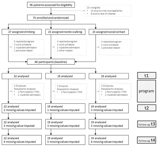 Data were analyzed using SPSS version 27 (IBM, New York, NY, USA). The statistical analysis was different for psychological and biological parameters. For all psychological parameters including symptoms of anxiety and depression, a pre-planned series of mixed 3 × 4 analyses of variances (ANOVA) was conducted. The ANOVA contained one between-subject factor group (3 levels: climbing group, Nordic walking group, and social contact group) and one within-subject factor time (4 levels: t1 (pre-program), t2 (post program), t3 (follow-up three months post program), and t4 (follow-up six months post program)). The time-by-group interaction analysis was considered the primary analysis of interest and was interpreted as different changes in psychological parameters across groups. The main effects of the factors time and group were also reported. Bonferroni-corrected post hoc tests were conducted as follow-up analyses for the main effects of group or time. Preliminary analysis included tests on homogeneity of variances (Levene test) and on sphericity (Mauchly test). Homogeneity of variances could be assumed in all analyses. Whenever sphericity could not be assumed, the Greenhouse Geisser correction was applied. Partial η2 was used as effect size. The analysis of the psychological parameters was done on an intention-to-treat approach. All missing values were imputed using the last observation carried forward method. For all biological parameters, difference variables between t1 and t2 did not show a normal distribution (Shapiro–Wilk test). Therefore, group differences in the change from t1 to t2 were analyzed using the Kruskal–Wallis test. Due to the number of missing values in the biological parameters, we abstained from an intention-to-treat approach for the biological parameters and used a per-protocol analysis. p-values below 0.05 were considered as significant (two-tailed). Although a large number of outcomes were analyzed, a type I error adjustment for multiple outcomes was not applied in order to avoid increasing the likelihood of type II errors [50]. Data are presented as the mean (M), standard deviation (SD), and median (Med).