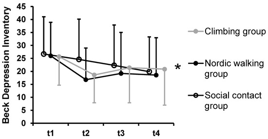 Symptoms of depression according to the Beck Depression Inventory by groups. Notes: * indicates a significant main effect of time. No significant group-by-time interaction emerged. Dots represent mean values; error bars indicate standard deviations.