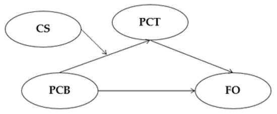 The mediation pathway of Hypothesis 1. Note. PCB = Perceived crime benefit, PCT = Proactive criminal thinking, FO = Future offending, CS = Crime strategy. The bold lines show mediation pathways (Hypothesis 1a), and the dashed line a moderation pathway (Hypothesis 1b).