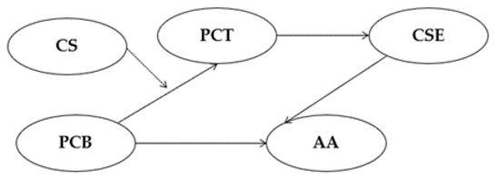 The mediation pathway of Hypothesis 2. Note. PCB = Perceived crime benefit, PCT = Proactive criminal thinking, CSE = Criminal self-efficacy, AA = Arrest avoidance, CS = Crime strategy. The bold lines refer to mediation pathways (Hypothesis 2a), and the dashed line to a moderation pathway (Hypothesis 2b).