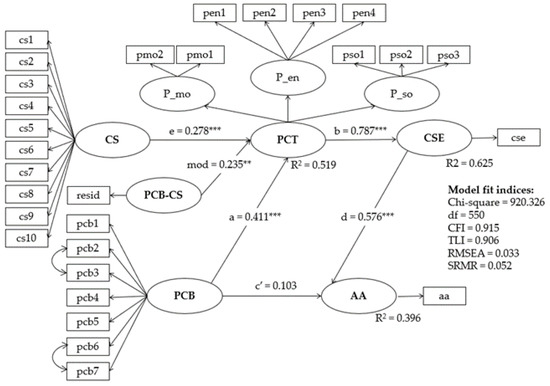The CFA confirmed measurement and structure model for further analysis. The model fit indices are listed in Table 2. The structure of PCT suggested from the result of first-order CFA was basically the same as EFA with only one item in entitlement removed because of its low factor loading (item in entitlement (“men who are really good at crime never seriously think about going straight”) was removed for its low factor loading during the first-order CFA). The model fit of PCT’s first-order and second-order CFA was both good with Chi-square = 42.177, df = 24, CFI = 0.965, TLI = 0.947, RMSEA = 0.034, SRMR = 0.04. For PCB, the CFA verified a 7-item measurement with two pairs of error correlation among the items (item in perceived crime benefit (“having a family”) was removed for its low factor loading during CFA; items “having living” and “owning expensive things,” and items “being my own man” and “being happy” were the two pairs that were error correlated). Its model fit was good with Chi-square = 52.478, df = 12, CFI = 0.960, TLI = 0.930, RMSEA = 0.08, SRMR = 0.046. For CS, the CFA confirmed a 10-item measurement (items in crime strategy (“learned about alarms, hours, or money transfers”; “decided to do the crime on the spot”) were removed for low factor loading). It’s model fit was good with Chi-square = 133.974, df = 35, CFI = 0.955, TLI = 0.942, RMSEA = 0.078, SRMR = 0.039. Composing the above measurement models together, the CFA for structure model also reached good model fit indices. All of the covariance among the measurement models were significant, ranging from [0.193, 0.549]. Hence, the structural model that was taken into next step included PCT (consisted of sub-scale P_mo (2 items), P_en (4 items), and P_so (3 items), PCB (7 items)), CS (10 items), and three single-item factors (single-item measurement model was constructed followed instruction in Gana et al. [72] (p. 151)): FO, CSE, and AA (Supplementary Materials Table S2).