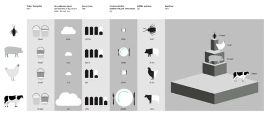 The production of edible insects for human consumption is responsible for around 95% less GHG emissions and LU and 62% less EU in comparison to beef production [93]. The environmental benefits of insects are much higher compared with other livestock (pork and poultry), achieving reductions of 90% in GHG, 61% in LU, and 56% in EU [93] (Figure 2).