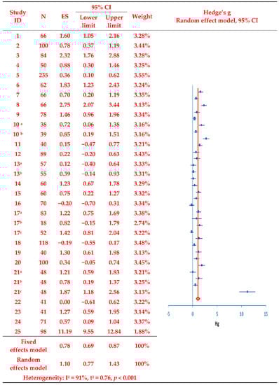 Study homogeneity in terms of effect size was tested according to the null hypothesis within chi-square testing by calculating the Cochrane Q value, and study heterogeneity was tested by calculating Higgin’s I2 and T2 values. In the case of this study, meta-analysis was performed using a random effect model since inter-study heterogeneity was confirmed and given the diverse characteristics of the evaluated studies. For a comparison among the studies, the effect size, which is a standardized form that can be compared, was used. The effect size of each study was calculated using the data measured immediately after the intervention of the experimental and the control group. The effect size is presented as Hedge’s g, based on the mean since Cohen’s d tends to overestimate the effect size when the sample is small []. Cohen’s d is the standardized mean difference between groups divided by the integrated standard deviation, and Hedge’s g is the adjusted effect size calculated by multiplying Cohen’s d by the correction factor []. If there are multiple intervention groups in the same study, the effect size was calculated for each data analysis as an independent study.