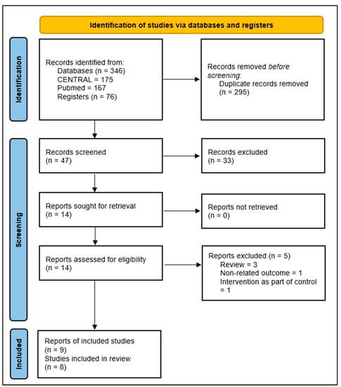 A total of 346 records were found from the comprehensive database search (Figure 1). Upon elimination of duplicates, a total of 46 records were screened for eligibility. We reviewed full copies of 22 studies; we identified 8 articles as possibly meeting the review inclusion criteria, and 5 that were not eligible for inclusion. Three were reviews [19,20,21], one trial did not include an outcome of interest [22], and in one trial the intervention was a part of the control [23]. Therefore, we included eight studies.