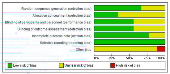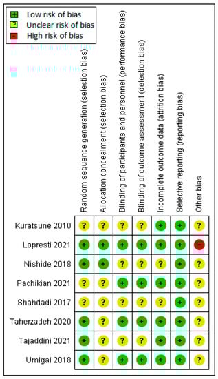 For allocation concealment, the selection bias in five studies was unclear risk [25,26,29,30,31], and all used computer-generated randomization. Three studies had unclear risks [24,27,28]. Allocation concealment methods were described in two studies [25,26] as low risk. However, six studies did not mention allocation concealment [24,27,28,29,30,31]. All eight studies included in this review used a placebo control. Four studies described the two components, blinding of participants and blinding of outcome assessment [25,27,29,31], as low risk. In four studies, the blinding of personnel was unclear [24,26,28,30]. The blinding of outcome assessments was not described in four studies [24,27,29,31] and was categorized as unclear risk. We judged blinding of personnel and outcome assessment as an unclear risk of bias. For incomplete data, six studies were assessed as low risk for attrition bias [24,25,27,29,30,31]. The incomplete data outcome was not described in the two studies [26,28]. Thus, we judged them as presenting an unclear risk of bias. All eight studies reported the outcomes specified in their methods section [24,25,26,27,28,29,30,31] for selective reporting and were assessed as low risk for selective reporting. We detected no other potential sources of bias.