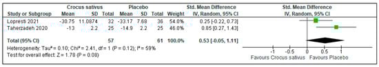 There was a small reduction in insomnia severity in the Crocus sativus groups compared with the placebo groups (SMD: 0.53; 95%CI: −0.05 to 1.11; I2 statistic = 59%; p = 0.08; 2 studies, 118 participants, moderate-quality evidence) [25,29] (Figure 4, Table 2).