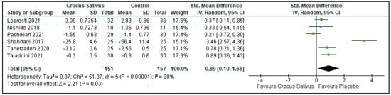 Crocus sativus increased sleep quality compared with placebos (SMD: 0.89; 95%CI: 0.10 to 1.68; I2 statistic = 90%; p = 0.03; 6 studies, 308 participants, very low-quality evidence) [25,26,27,28,29,30]. (Figure 5, Table 2).