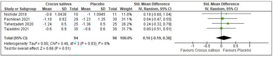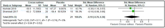 There was no difference in anxiety level between the Crocus sativus group and the placebo group in 2 trials (SMD: −0.19; 95%CI: −0.76 to 0.38; I2 statistic = 0%; p = 0.52; 2 studies; 51 participants, low-quality evidence) [26,28] (Figure 11, Table 2).
