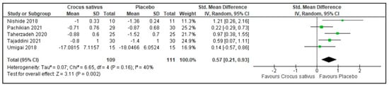 Subgroup analysis by Crocus sativus preparation cannot be performed due to a limited number of trials.