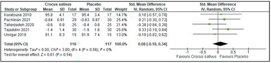 There was no difference in sleep efficiency between the Crocus sativus groups and the placebo groups in 5 trials (SMD: 0.08; 95%CI: −0.18 to 0.34; I2 statistic = 0%; p = 0.54; 5 studies; 233 participants, low-quality evidence) [24,27,29,30,31] (Figure 8, Table 2).