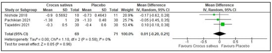There was no difference in sleep disturbances between the Crocus sativus groups and the placebo groups in 3 trials (MD: 0.01, 95%CI: −0.20 to 0.21; I2 statistic = 0%; p = 0.96; 3 studies; 140 participants, moderate-quality evidence) [26,27,30] (Figure 9).
