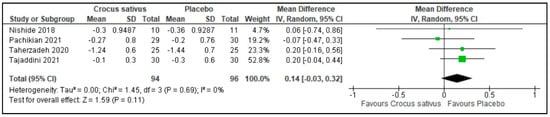 There was no difference in the usage of sleep medications between the Crocus sativus groups and the placebo groups in 4 studies (MD: 0.14; 95%CI: −0.03 to 0.32; I2 statistic = 0%; p = 0.11; 4 studies; 190 participants, moderate-quality evidence) [26,27,29,30] (Figure 10, Table 2).