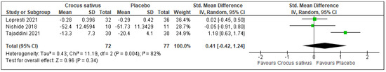 There was no difference in depression level between the Crocus sativus group and the placebo group in 3 studies (SMD: 0.41; 95%CI: −0.42 to 1.24; I2 statistic = 82%; p = 0.34; 3 studies; 149 participants, very low-quality evidence) [25,26,30] (Figure 12).