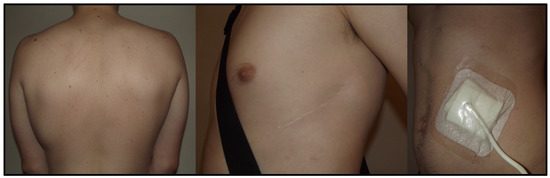 - A 12-year-old female patient with long QT syndrome (5 points on the Schwartz scale), confirmed by genetic testing, treated with propranolol. While playing in a pool (despite the ban, she bathed and played ball in the pool), the girl lost consciousness for about 2 min. The loss of consciousness was sudden and was not preceded by palpitations or a feeling of weakness, visual disturbances, or dizziness. During the period of unconsciousness, the girl first presented with tautness; she was pale, limp, and did not respond to stimuli. After being taken out of the pool, she was still unconscious, without a pulse. After consciousness returned, there was no confusion or excessive sleepiness. Since then, QTc 0.46–0.5 s has been observed. The girl’s older brother is also a patient of the Clinic; he was diagnosed with LQTS, which was genetically confirmed. During the course of diagnosis of both children, their mother was also diagnosed with prolongation of QT interval, as well as their grandmother. During the girl’s exercise stress test, QTc at the 4th minute after exercise was 0.49 s. Due to her very slim body structure and low weight (38 kg), the procedure was technically difficult, but it was possible to create an intramuscular pocket. The procedure was performed using a two-incision technique. There were no complications. On day 2, the patient was mobilized, and after about a week during a control visit, she presented without pain with almost the entire range of left-hand movement was recovered (Figure 5).