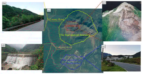 The open-pit mine and surroundings areas: (a) the satellite view of the surface of the open-pit mining area; (b) county road; (c) collapse pit model; (d) Gangang River; (e) the industrial site of beneficiation.