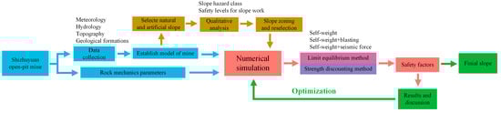 In order to systematically understand the slope stability of the Shizhuyuan mine, ensure the safety of the excavation process, and analyse the feasibility of its open-pit mining solution, this study comprehensively presents the following aspects and the flow diagram of stability analysis shown in Figure 2: