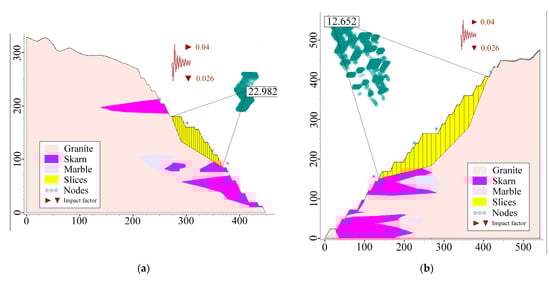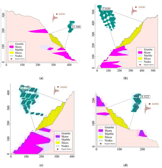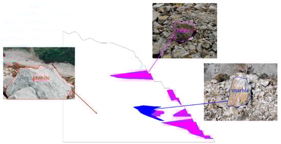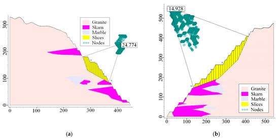 As the underground to open-pit mining of the Shizhuyuan polymetallic mine is still in the feasibility study stage, the slopes within the open-pit boundary have not yet been actually formed, so with reference to geological data and combined with the results of the site investigation, the rock structure type of the slopes of the Shizhuyuan polymetallic mine open-pit mine belongs to the laminated structure, the shape of the structure body is mainly laminated and slab-like, the structure surface has laminae, lamellae, and joints, and there are often inter-layer misalignments. Its deformation and strength characteristics are controlled by the combination of layers and rock strata and can be regarded as an elastic–plastic body, which may produce sliding, bending, and tensioning damage to rock strata and plastic deformation of weak rock strata. The degree of rock integrity of the slopes of open-pit mines is relatively intact. According to the analysis in Table 4, the slopes of the Shizhuyuan polymetallic mine open-pit mine are layered rock slopes, which are classified as the same tendency and oblique slopes, so the slope damage modes are planar, folded line, and wedge [].