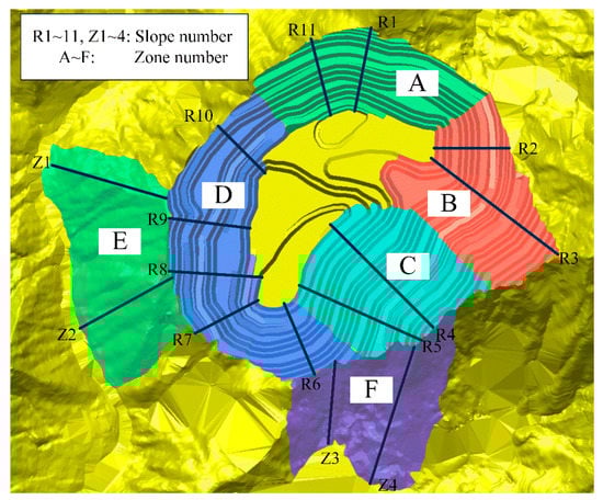 According to the classification of slope grades in the table, the geometric parameters of the selected slopes, engineering geological conditions, and other factors, the artificial mining slopes in the high and steep slopes are divided into four zones, A, B, C, and D (A: R1, R11; B: R2, R3; C: R4, R5; D: R6~R10), and the natural slopes are divided into two zones, E and F (E: Z1, Z2; F: Z3, Z4). The zoning diagram is shown in Figure 5.