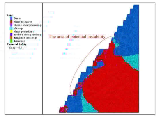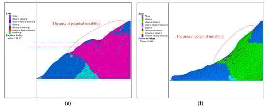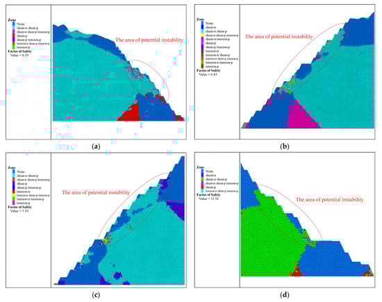 After each 2D section model is stretched 20 m along the vertical direction, the FLAC3D calculation model of the 2D slope is obtained, and the strength reduction method of FLAC3D is used to calculate and analyse it under the normal working conditions of self-weight stress. The calculation results are shown in Figure 6, which shows the plastic zone condition of each refuge break in addition to the safety factor and the potential instability area.
