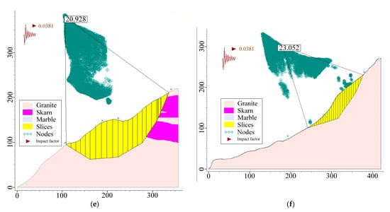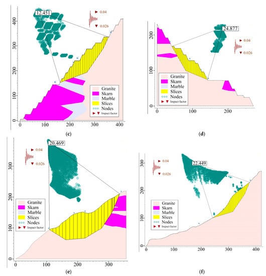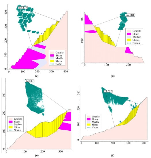 Calculation results of the limit equilibrium method (self-weight + blasting): (a) R1; (b) R3; (c) R4; (d) R8; (e) Z1; (f) Z4.