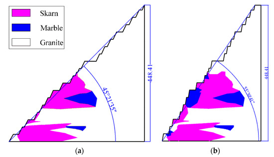 After on-site rock sampling and laboratory rock mechanics tests, the mechanical parameters of the rock were obtained, but they could not be directly used for theoretical calculations. This is because the rock mass mainly consists of rock and structural faces, and the mechanical parameters of the rock mass are significantly different from those of the intact rock mass under the weakening effect of the cutting of the structural faces, so the mechanical parameters of the rock need to be reduced. Therefore, the mechanical parameters of the rock were reduced to rock mass mechanics based on Hoek–Brown strength criterion. The final obtained mechanical parameters of the slope rock masses are shown in Table 1. Among them, the mechanical parameters of the skarn rock mass are all used for the ore body, and the surrounding rocks are divided into two types: granite and marble. For example, the geological section of the R1 slope of the open pit is shown in Figure 3.
