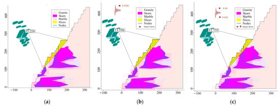 Results of the adjusted R3 slope for the limit equilibrium method: (a) self-weight; (b) self-weight + blasting; (c) self-weight + seismic force.