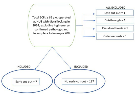 We evaluated 204 titanium Gamma 3 trochanteric nails (hereafter Gamma3T)—length of 180 mm and distal width of 11 mm, with neck–shaft angle between 120° and 130° (Stryker® Trauma GmbH, Schörnkirchen, Germany)—with a total of 7 cases called “Early cut-out” (3.55%) and 197 called “No early cut-out” (96.55%). Four major mechanical complications were excluded due to possible interference: one late cut-out, one cut-through, one pseudarthrosis and one osteonecrosis (Figure 1).