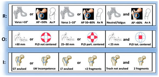 - Avulsion: Defined as a radiolucent space > 5 mm in any radiological view of the greater trochanter (GT) or the lesser trochanter (LT);