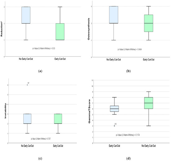 The GammaTScore osteosynthesis parameter was statistically similar, despite TAD being greater than 25 mm in the early cut-out group. Limited TAD and centre–centre positioning have been incorporated since the 1990s and are generally accepted in routine practice, as they are in our centre. Their minor role is probably due to minimal absolute differences in PLD procedures between cut-out and non-cut-out cases, as occurs in our work, which could explain the fact that these variables are currently being challenged [17].