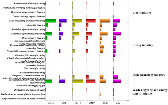 The changes in the MDA industrial structure were indicated by the changes in CO2 emissions across the sectors. It can be noted from Figure 4 and Figure 5 that the heavy industry CO2 emissions contributed the most to the MDA industrial energy consumption emissions, and its proportion increased from 41% in 2016 to 53% in 2021. General equipment manufacturing and the automobile industry were the main emission sources of the heavy industry, accounting for over 45% of the heavy industry CO2 emissions. This was followed by the light industry, which, in contrast with the heavy industry, showed an annual downward trend from 34% in 2016 to 16% in 2021. Food processing and manufacturing were the largest emissions source in the light industry, accounting for more than 90% of its CO2 emissions. Equipment manufacturing, automobile industry, and food processing and manufacturing are the three pillar industries of the MDA. Accordingly, these industries were the main MDA CO2 emission sources. Compared with other industries, the high-technology industry maintains a relatively stable contribution to CO2 emissions, with an annual average contribution rate of 28%. In recent years, the CO2 emissions of computers, communications, and other electronic equipment manufacturing grew rapidly, accounting for nearly 40% of the high-technology industry CO2 emissions. This indicated the rapid development and industrial advancements in the Yangtze River Delta and Pearl River Delta areas. Furthermore, the waste recycling and energy supply industry had the lowest CO2 emissions, indicating that its development is still in its infancy.