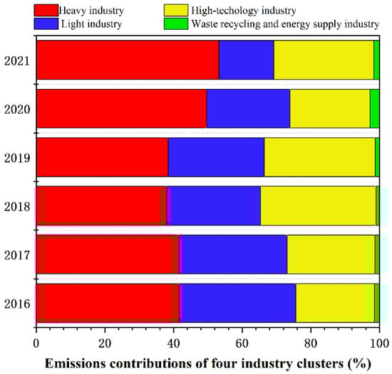 CO2 emissions contribution rates of four industry clusters from 2016 to 2021.