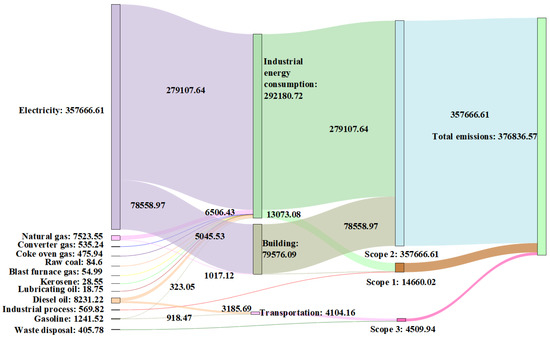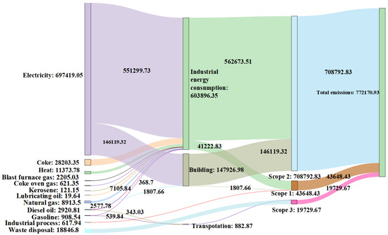 The MDA CO2 flow charts of 2016 (Figure 6) and 2021 (Figure 7) were constructed based on the calculated data and scope of CO2 emissions. Different emission sources are represented in different colors, and the width of the branches corresponds to the size of CO2 flow (Figure 6 and Figure 7).