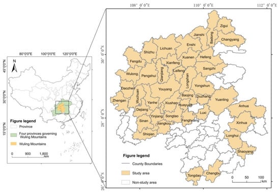 The Regional Development and Poverty Alleviation Plan of The Wuling Mountains Area (2011–2020) divides the Wuling Mountains area into 42 key counties for national poverty alleviation and development work, 13 provincial-level key counties and 11,303 poverty-stricken villages. In this paper, 42 state-level poor counties were selected as study areas (Figure 1). Forty-two state-level poverty-stricken counties span Hunan, Hubei, Chongqing and Guizhou provinces, covering an area of about 97,400 square kms, accounting for 56.7% of the Wuling Mountains area. Among them, there are 10 counties and districts in Hubei province, 7 counties in Chongqing city, 15 counties in Hunan province and 10 counties in Guizhou Province. In 2019, the study area had a population of 21,236,200 people, including about 45% from the minority groups such as Tujia, Miao and Dong.