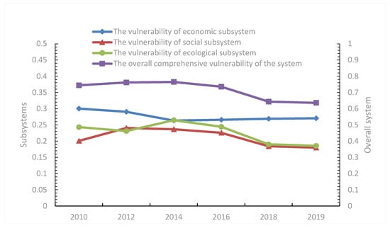 The overall comprehensive vulnerability of the system of the Wuling Mountains area presents a trend of “slow rise–steady decline”. It reached a peak of 0.7649 in 2014 and hit a minimum of 0.6273 in 2019. The vulnerability timing of each subsystem varies as follows: