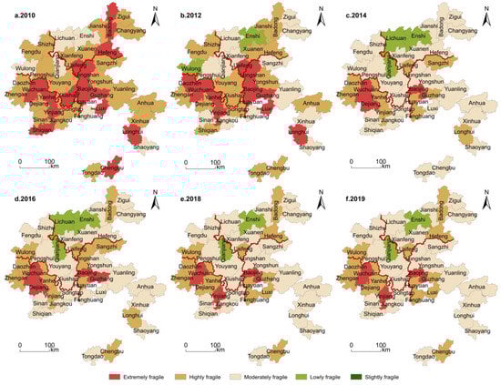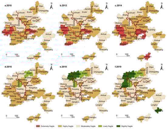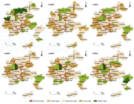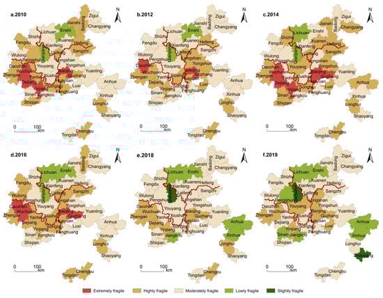 From 2010 to 2019, the overall comprehensive system vulnerability of the Wuling Mountains area showed a trend of “slow rise–stable decline”. In 2010, most counties and districts began to pay attention to the development of tourism, and the number of tourists gradually increased. However, the ruthless exploitation brought about by tourism development had led to the increasing environmental pollution and ecological crisis [29]. Additionally, the high-level innate vulnerability of the system rendered the overall vulnerability of the area at a high degree. With the implementation of the “targeted poverty alleviation” strategy in 2013, under the background of strong support from the national poverty alleviation policy, the poverty alleviation and development of the tourism industry was improving rapidly. The development mode of social and economic structure was changed, the number of tourists was on the rise, and the overall system development was under full swing [51].